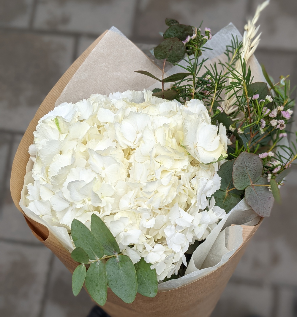 A bouquet of hydrangea, eucalyptus and dried flowers is an ideal option for a small but very cute bouquet.
