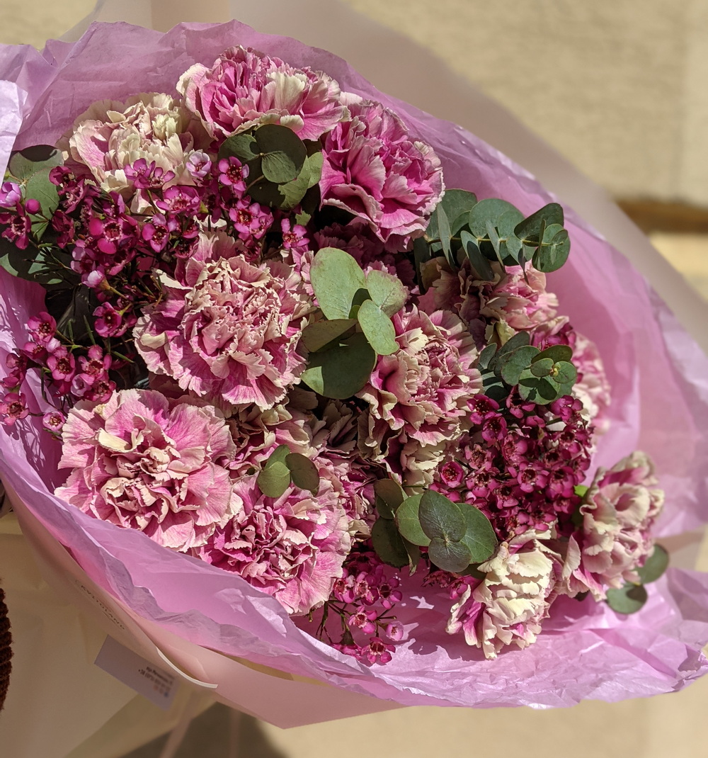 A very delicate bouquet of carnations with fragrant chameleon and eucalyptus.