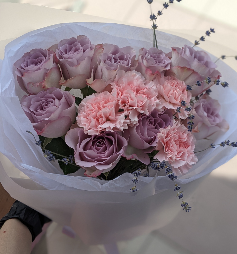 The bouquet is complimented by a charming memory lane rose in a soft purple shade, with carnations and lavender.