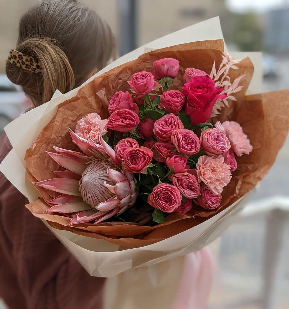 Exotic collectable bouquet with protea, bush peonies and dried flowers.
